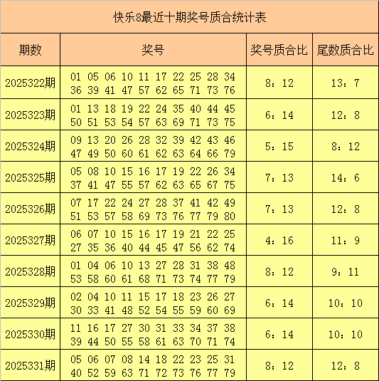 福彩快乐8第2025331期开出奖号:05 06 07 08 14 18 22 23 25 31 40 52 59 63 71 72 73 76 77 79,其中奖号质合比为8:12,奖号尾数质合比为12:8。